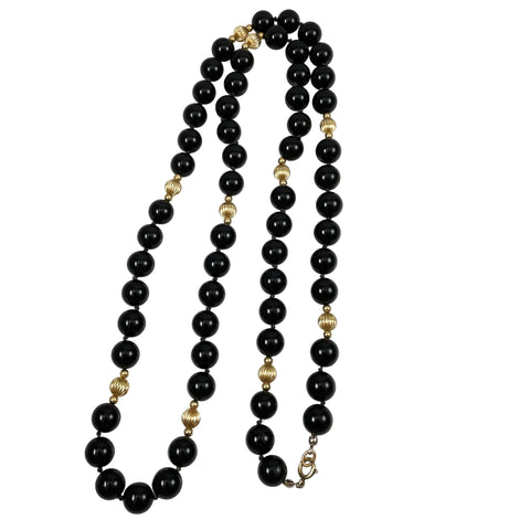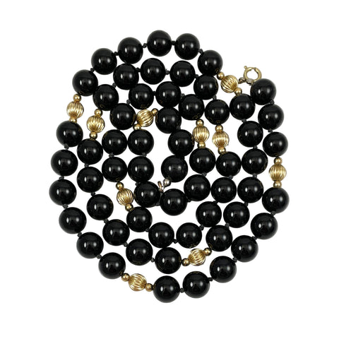 Classic extra long Black Onyx and Gold vintage hand knotted necklace! The gleaming necklace is made of 12mm black onyx gemstone beads and accented with gorgeous gold filled fluted beads. These are high quality beads, each hand knotted with excellent polish. The necklace is 38 inches long and can be worn as a single strand or you can double them. Necklace is in perfect condition. The vintage gemstone necklace has a gold tone spring ring clasp. (But its long enough to slip over your head).
