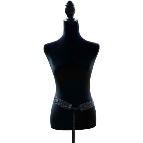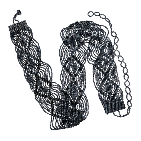 A vintage Beaded Belt handcrafted from black and silver glass seed beads. This design is intricate and must of taken hours and hours to create! This wide beaded belt has a long fringe that is used a clasp that makes the size adjustable. What a fun piece to wear!