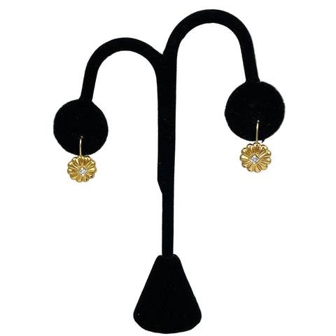 These are elegant Carolee rhinestone floral earrings. They have round gold flowers with clear sparkling rhinestones in the center. Carolee is known for their fabulous, high quality costume and fashion jewelry.