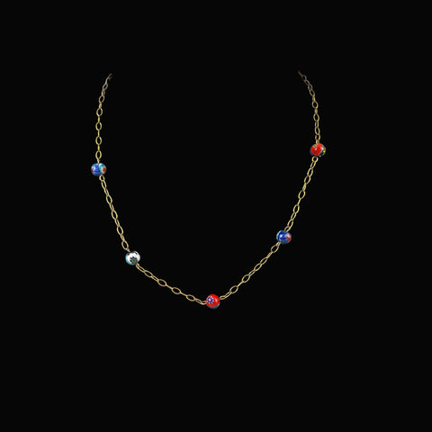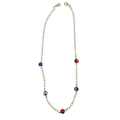 This gorgeous necklace features Millefiori Glass Beads from the Isle of Murano in Italy. The colorul glass beads are stationed on a gold filigree chain. The necklace has a secure spring ring clasp.