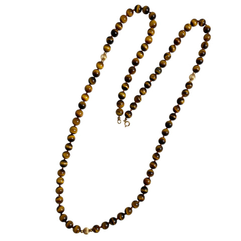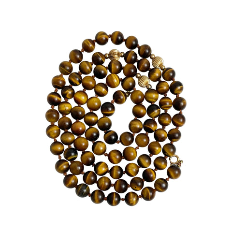 This elegant long necklace is composed of 8mm Tiger's Eye gemstone beads. The beautiful beads are hand knotted on silk and are very nicely polished. Gold fluted beads add a beautiful highlight. These Tiger's Eye gemstones are from the quartz family and have lovely even horizontal banding and nice chatoyancy. It has a 14K spring ring clasp that is very secure.