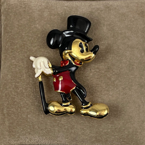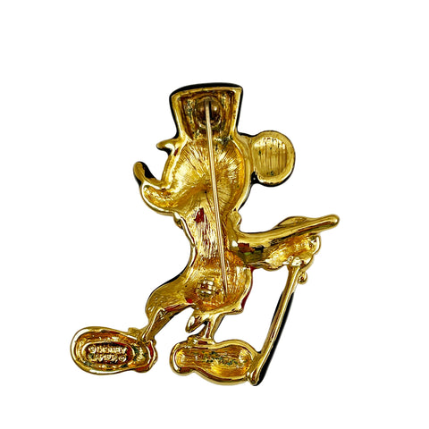 This vintage Mickey Mouse brooch showcases expertly applied enamel work in vibrant red, white, and black against warm gold-tone metal. The iconic character is rendered in classic style, complete with top hat and cane—a refined representation of Disney's most recognizable figure. A nice piece for collectors and vintage jewelry enthusiasts seeking authentic mid-century character pieces with superior craftsmanship.