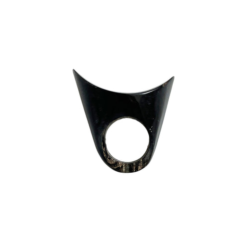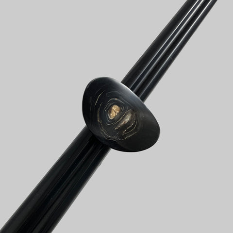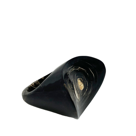 Vintage Carved Black Coral Ring from Hawaii. This is a large and rare ring carved from a single piece of natural black coral. You can see the brown rings and veining in the center, which gives it lots of character. This vintage ring has a modernist style and measures 1¾ x 1¼ across the face. It is a wonderful unisex design in a large size 9.5. For many years people have believed coral has protective powers. It was often gifted to children and relatives.