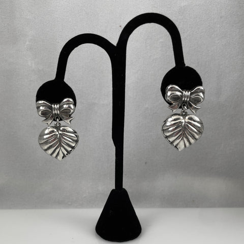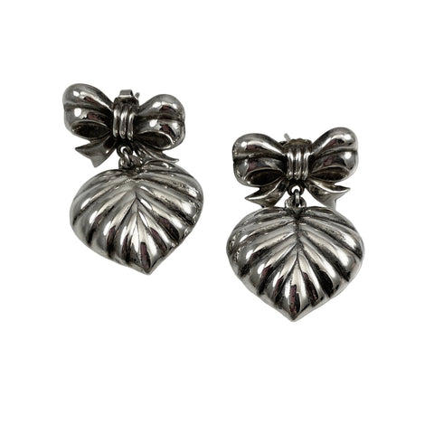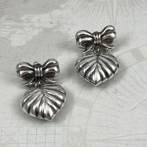 These vintage sterling silver earrings feature elegantly fluted heart pendants suspended from large bows, creating graceful movement with each wear. The puffy heart design showcases refined craftsmanship characteristic of quality vintage jewelry. Excellent condition throughout makes these a distinguished addition to any collection.