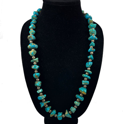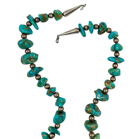Wonderful vintage Navajo silver and turquoise long beaded necklace. This Native American necklace is 30' inches long and is composed of genuine turquoise nugget beads with 7mm silver rounds in between. The polished turquoise nuggets are sized from 15mm to 24mm and are a true turquoise blue color with some color variations and brown matrix. This vintage turquoise necklace has sterling silver cones and closes with a traditional hook and eye clasp. It is a wonderful piece of Navajo Jewelry to be treasured in your collection and worn for any occasion. The necklace is unsigned, which is common for older Navajo pieces.