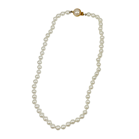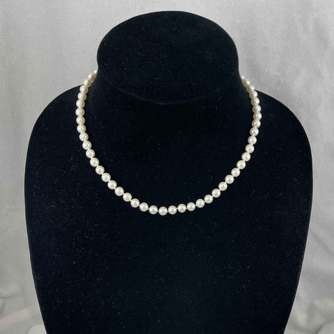Beautiful vintage Carolee necklace featuring 6mm round white glass pearls individually knotted on silk. This wonderful necklace showcases Carolee's renowned craftsmanship. This vintage pearl necklace has a matching gold-tone box clasp closure.