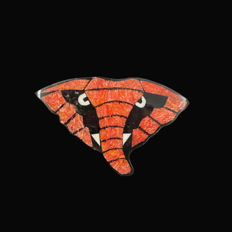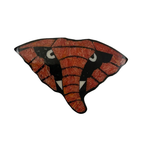 Striking red coral mosaic brooch fashioned into an elephant's face designed by Lee Sands. The elephant has mother of pearl eyes and tusks as accents. Wonderful example of modernist and figural jewelry that was popular in the 1970's. This is natural red coral that has not been dyed. The back has black resin plastic on it to stabilize the design and make it sturdy.  This vintage coral brooch is in Excellent condition. We have a matching elephant necklace.