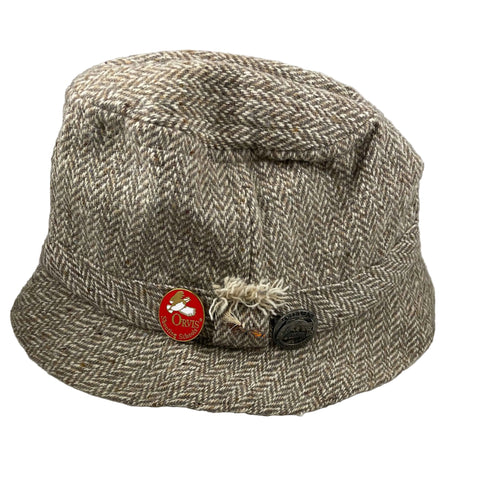 A handsome brown wool Irish Tweed Hat. This hat was handcrafted in Donegal, Ireland by Hanna Hats. The walking style hat is a brown and white herromgbone tweed. The hat is a vintage piece from an estate in Texas, but looks like it's in new condition. It has a couple of Orvis pins on the side.