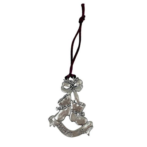 Seagull Pewter holiday ornament "Baby's First Christmas" from 1993. It is a pair of baby booties with a bow on the top. It is a collectible ornament and is in excellent condition.