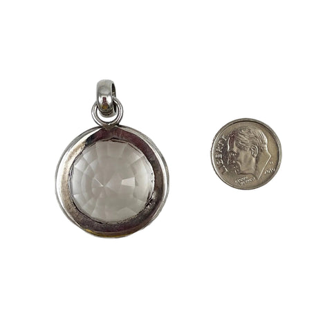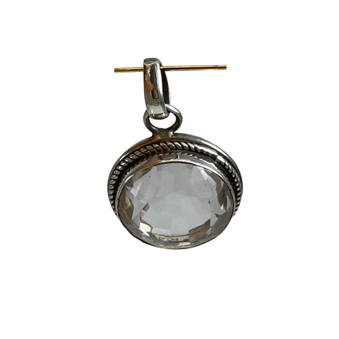 This is a lovely Large Rock Quartz gemstone round pendant. This quartz gemstone is crystal clear. It is beautifully faceted with a pointed back to really capture and reflect the light. It has a sterling silver rope frame. The cabochon is 24mm round and 18mm in depth. The pendant has a large bail on the top that can easily slip on a cord, chain or necklace (not included).