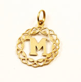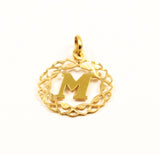 Fabulous Circular Monogram Initial M Pendant. It is surrounded by an intricate diamond cut frame. The pendant is solid 18K gold and it has a large bail on the top that will accommodate a chain or it could be added to bracelet. Initial pendants are very popular now and we make the perfect gift.