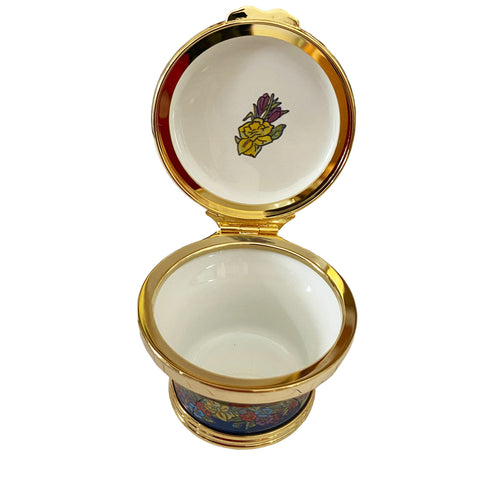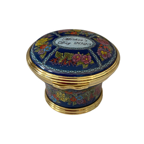 Wonderful enamel box made by Halcyon Days. This lovely enamel box features beautiful flowers on a navy blue background. This 2023 Mother’s Day box enamel box marks the 49th installment to a much-loved annual tradition. Its design, inspired by the sights of spring, depicts an abundance of blooming flora and evokes new life, growth, and gratitude. As ever, the piece has been entirely handcrafted by the Halcyon Days master artisans. The lovely pill or trinket box is from England. The round enameled box was hand-enameled with 24k gold plated fittings, using the same techniques used by the original 18th-century artisans. Comes in the original box. Made in England.  Celebrate Mother’s Day with a beautifully made gift she will cherish forever. Retail price $350.