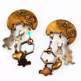 Whimsical vintage earrings made of brass and sterling by artisan Susan L. Richardson in 1994. The "Stick It In Your Ear" earrings feature a frog sitting on the top of a brass crescent, with three sets of charms dangling below. The dangles have a hare (rabbit), heart and tortoise (turtle) along with crystals. These earrings were handmade and have great movement; surely an attention-getter. Her designer earrings are rare, so very collectible. They are truly striking examples from her humorous jewelry line, "Stick It In Your Ear". The card has more information on the designer and her jewelry and is for informational purposes, it is not included.