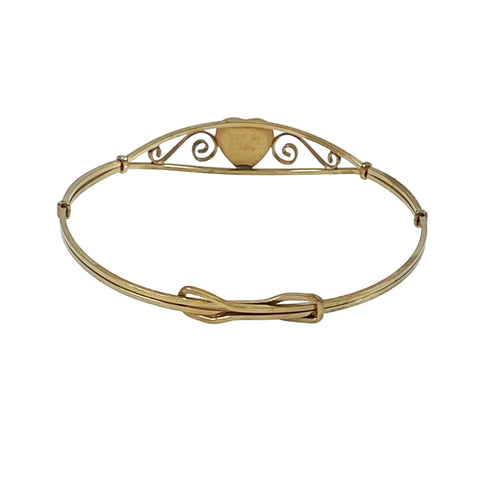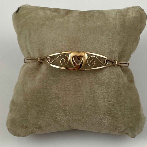 This charming gold filled bangle bracelet from the 1940's features an elegant scrolling motif centered with a delicate heart—a timeless design perfect for a young wearer. The bracelet slides open wider for sliding on and off.. Crafted with quality gold fill and preserved in excellent condition, this vintage piece has a nostalgic appeal, making it an ideal heirloom gift or collectible addition.