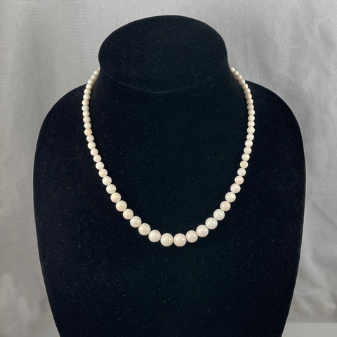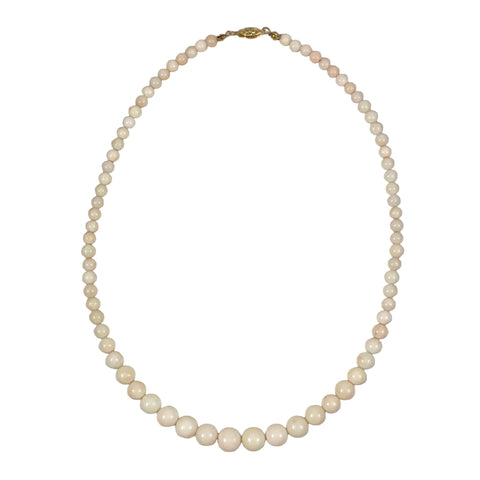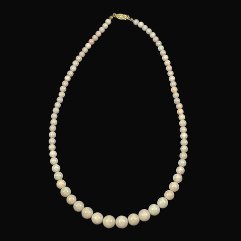 This is an elegant coral necklace of graduated round beads. The vintage coral beads are AA quality, all natural and haven't been treated in any way. The beads are graduated from 5-10mm and are a lovely white with a tinge of blush pink. They have a beautiful polished shiny finish and is in excellent condition.  It has a 14K solid gold filigree pearl clasp that is very secure.