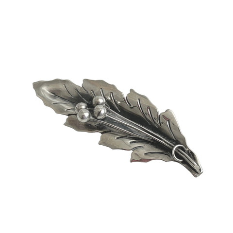 A stunning vintage Mexican sterling silver brooch featuring an intricate 3D leaf design adorned with delicate berry stems. Handcrafted and signed RJP with authentic eagle 3 hallmark, this 1960s Taxco piece showcases exceptional artisanal detail and beautiful patina. At 3 inches long and weighing 9.77 grams, it's a substantial, wearable statement piece in excellent condition. The versatile unisex design and lustrous finish make it perfect for collectors or anyone seeking authentic vintage Mexican jewelry with character and craftsmanship.