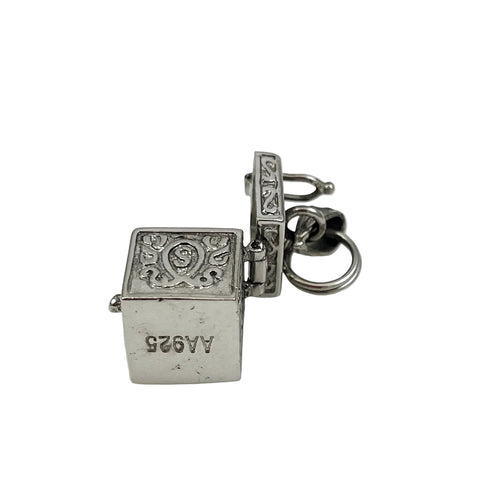 Sterling Silver Prayer Box Pendant or Charm. It has a hinged lid that opens revealing an empty box to hold small keepsakes, prayers, wishes, messages etc.... The ousided of the box is decorated with an intricate engraved design including hearts and the letter S. It is a wonderful mechanichal charm for your collection.