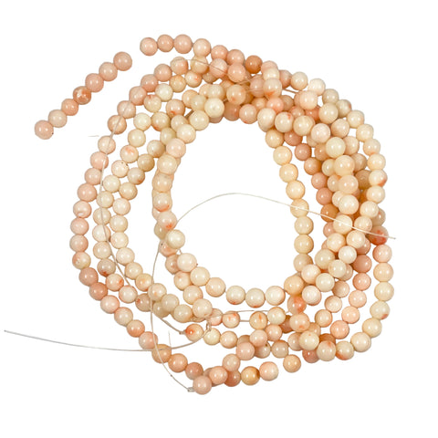 These are genuine AA quality pink coral round beads. They are a light to medium pink color with some white. These beads are also called angel skin coral, but the color is a little darker then some angel skin. Traditional round shape that has been highly polished, with minimal flaws or pores. We also sell them by the strand.