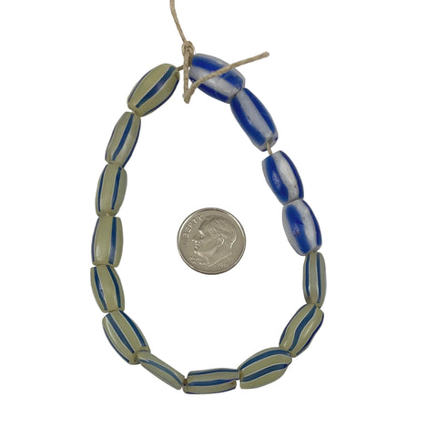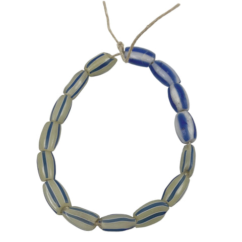 These African Trade Beads are antique Italian Venetian Glass Beads from the early 1900's. They are drawn onionskin oval beads that were traded to Africa. The Italians are famous for making the highest quality glass beads. These tube shaped beads are blue and white striped ovals. They are 7mm in diameter with a length that varies from 13-16mm. You are getting these exact 15 beads in an order. These antique beads show some signs of wear, which adds to their beauty and story.