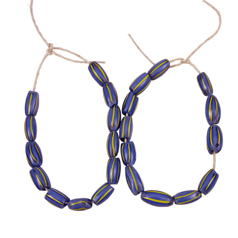 These beads are antique Italian Venetian Glass Beads from the early 1900's. They are drawn onionskin oval beads that were traded to Africa. The Italians are famous for making the highest quality glass beads. These tube shaped beads are blue with yellow stripes. They are 7mm in diameter with a length that varies from 13-16mm. You are getting 12 beads in an order. These antique beads show some signs of wear, which adds to their beauty and story.